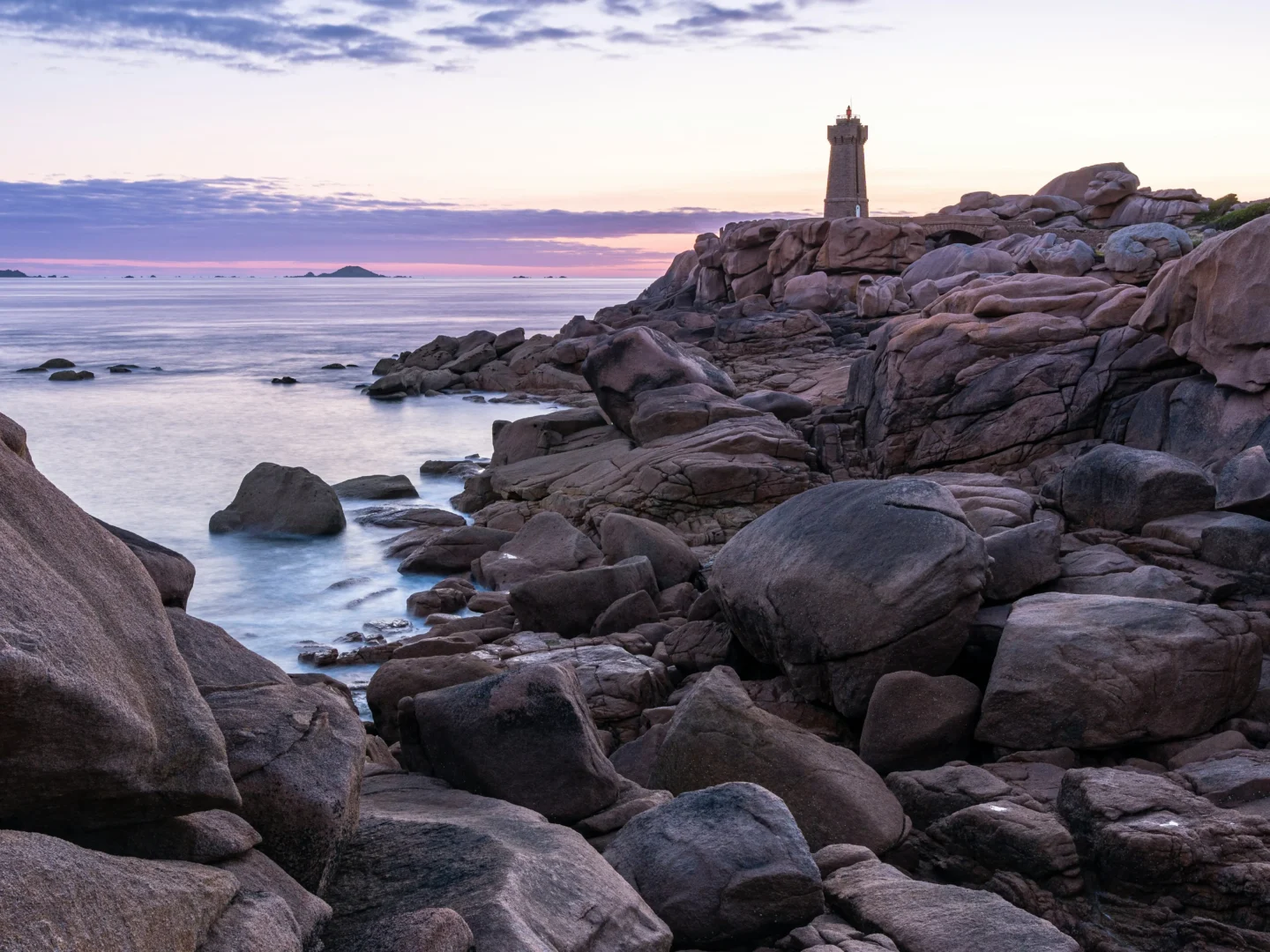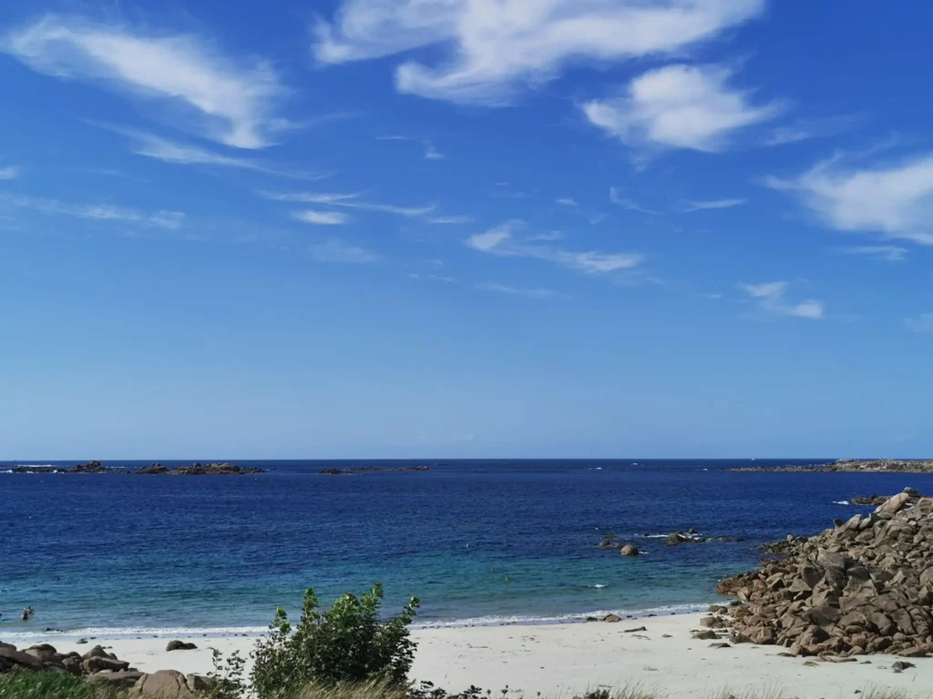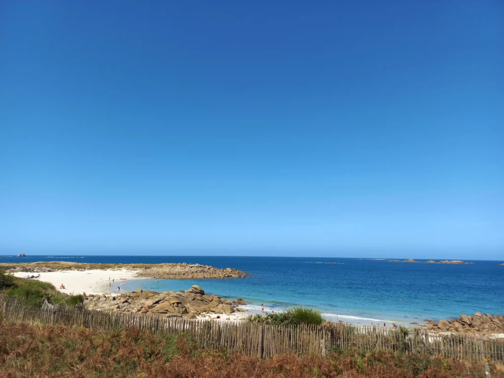 À seulement 20 minutes Landrellec, Ploumanac’h est un ancien hameau de pêcheur de Perros-Guirec. C’est aussi le point de départ de la découverte de la Côte de Granit Rose : un littoral breton unique, connu pour ses énormes blocs de granit aux teintes rosées sculptés par la mer et le vent. Le sentier des douaniers (GR34) mène entre criques, chaos rocheux et points de vue sur la mer. Le phare de Mean Ruz est un repère emblématique sur cette côte cuivrée. Plus loin, la plage de Saint-Guirec déroule son sable doré au pied d’une chapelle dédiée au saint protecteur des marins. En fin d’après-midi, les lumières rasantes transforment le granit en une palette changeante. Une des plus belles randonnées en Bretagne, accessible à tous, pour voir la vie en rose.