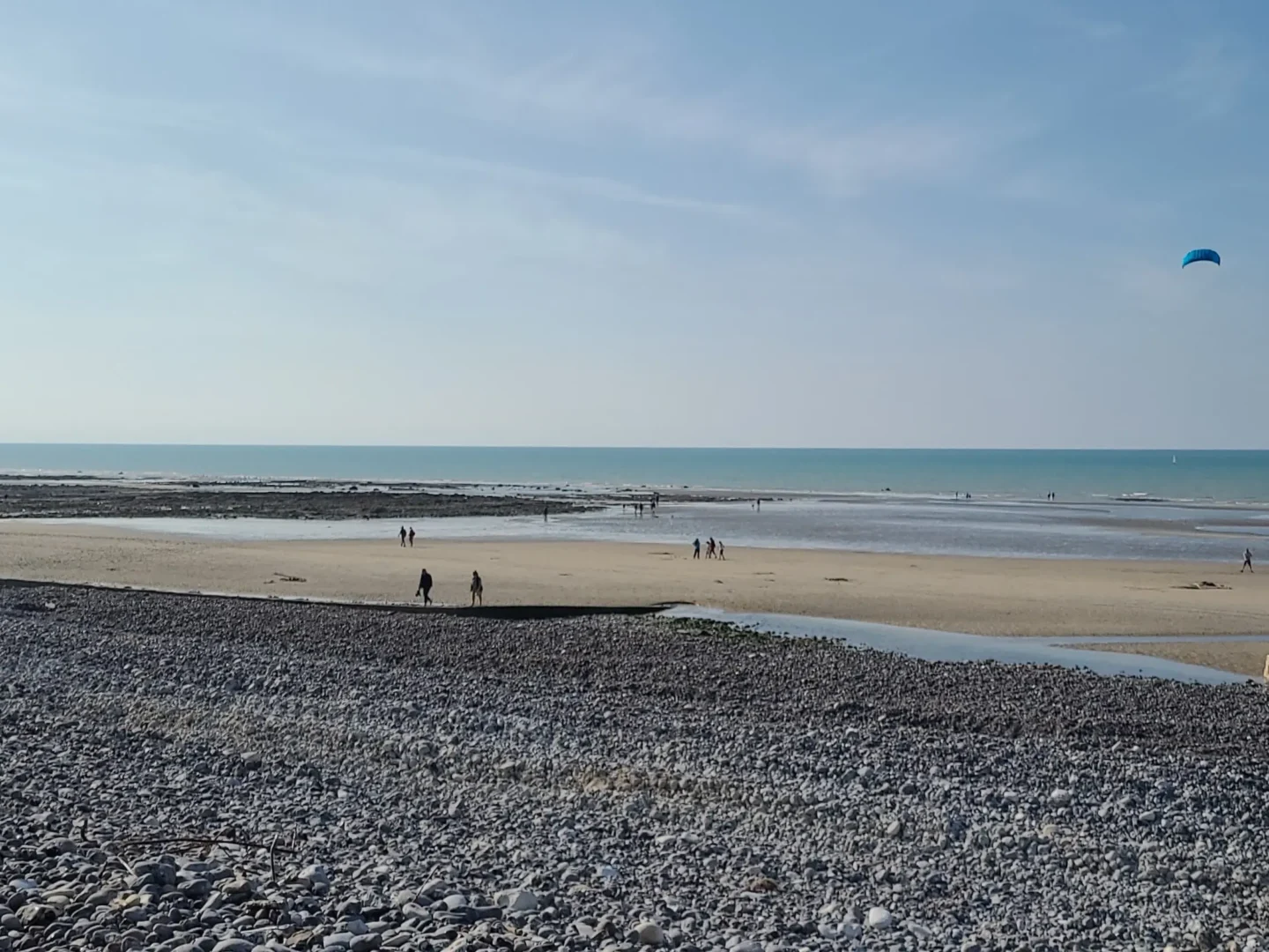 La plage de Quiberville-sur-Mer s’étend le long de la Côte d’Albâtre, avec un sol souvent de galets qui laisse apparaître un vaste espace sableux à marée basse.