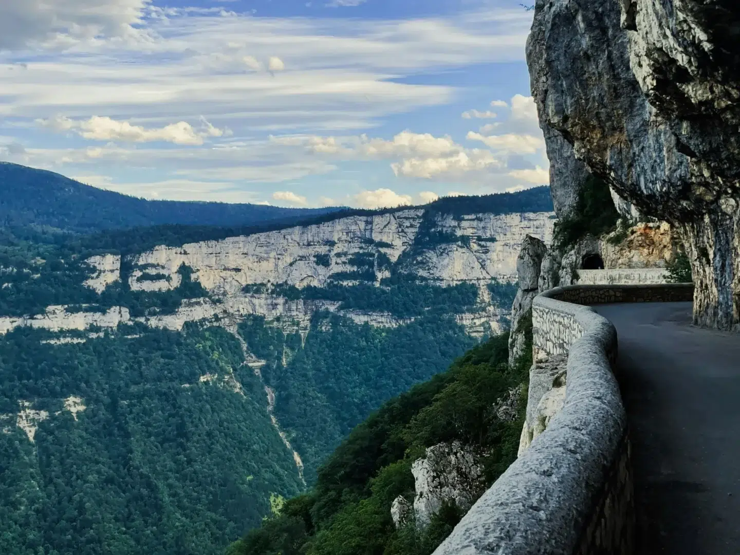 Cette route vertigineuse taillée dans la falaise défie les lois de l’équilibre depuis 1898. Les ingénieurs du XIXe siècle ont sculpté cette corniche pour transporter le bois du plateau de Lente. Cette prouesse technique est l’une des lieux les plus photographiés du Vercors. La voie serpente sur 4 kilomètres entre 253 et 1015 mètres d’altitude. Les encorbellements dominent la vallée du Royans de 700 mètres. Des tunnels creusés dans le calcaire et des panoramas saisissants rythment l’ascension. Le monastère orthodoxe Saint-Antoine-le-Grand ponctue le paysage grandiose. En voiture ou à VAE, elle offre une immersion nature et sensations fortes. Un passage obligé accessible depuis votre camping à St-Jean-en-Royans (15 min – 10 km).