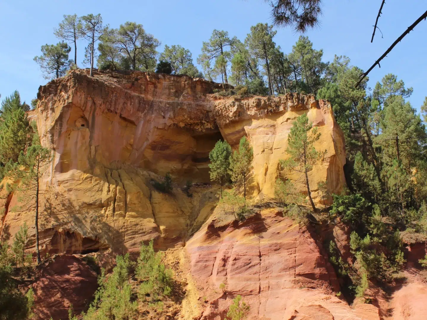À seulement 10 km du camping, le Colorado Provençal de Rustrel, surnommé le « Grand Canyon français », dévoile un paysage lunaire aux couleurs flamboyantes. Ces anciennes carrières d’ocre, façonnées par deux siècles d’extraction industrielle puis sculptées par l’érosion, offrent un spectacle géologique unique en Europe. Les falaises déclinent une palette chromatique exceptionnelle : rouge vermillon, jaune doré, orange cuivré et blanc crayeux.