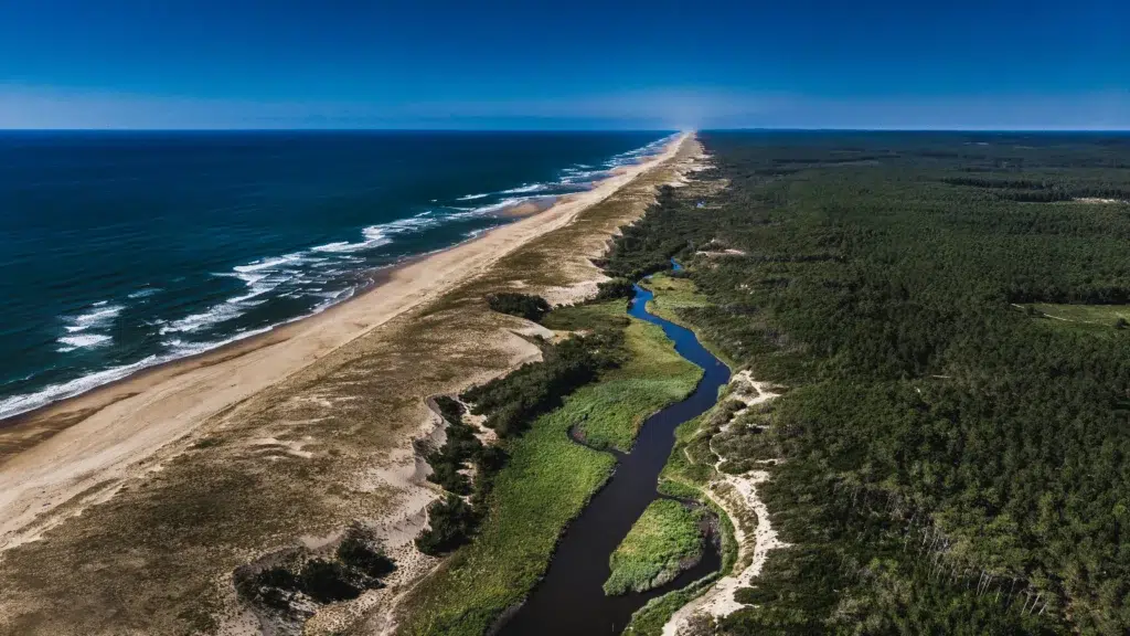 Envie de poser votre serviette dans un cadre apaisant ? Direction les plages du lac de Sanguinet, notamment la plage de Caton ou la plage du Pavillon, parfaites pour une baignade en famille. Ici, pas de vagues ni de courant fort : l’eau est peu profonde, et les pins vous offrent un peu d’ombre pour la sieste. Les aires de pique-nique et les jeux pour enfants complètent ce décor de carte postale landaise.