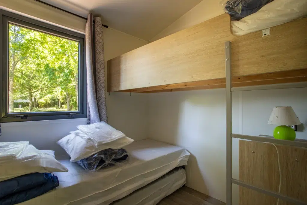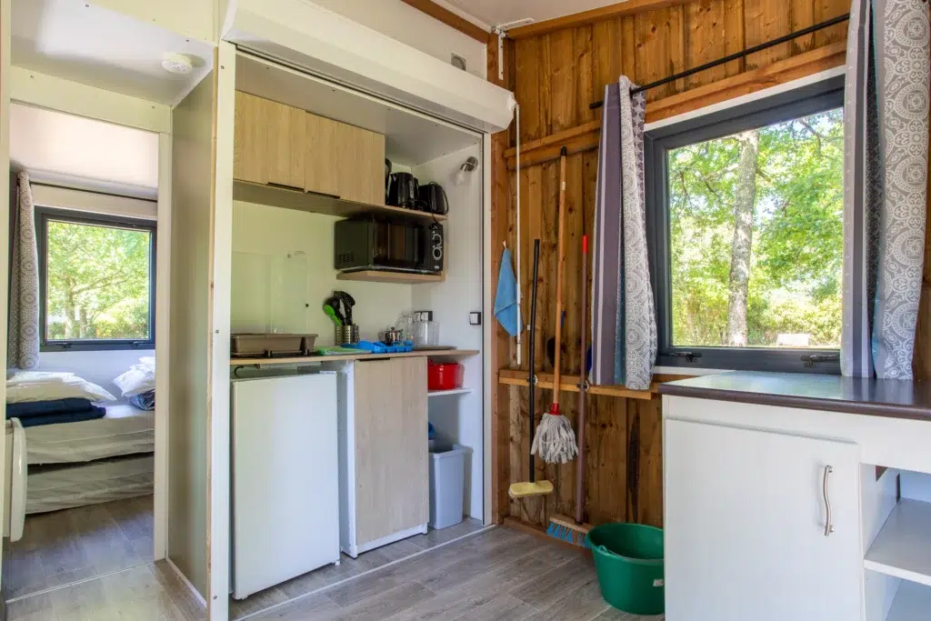 La nouvelle formule du Tithome (sans sanitaire, ni eau) propose un véritable retour à la nature avec son bardage en bois et son toit en palme. Ce mobile home cabane est équipé d’un séjour, d’une cuisine équipée et de 2 chambres (une chambre avec un lit en 140 et une 2ème chambre avec 3 lits simples).
