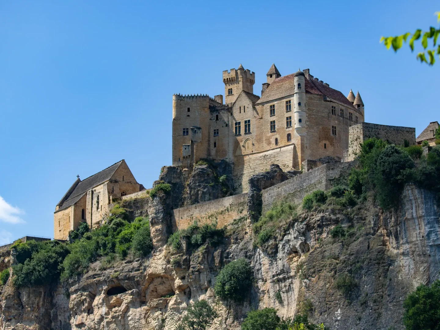 À environ 10 km au sud de Sarlat-la-Canéda, le village classé de Beynac-et-Cazenac domine la vallée depuis son éperon rocheux. La forteresse de Beynac, édifiée au XIIe siècle et assiégée par Richard Cœur de Lion, se visite encore avec ses remparts et sa vue spectaculaire sur la Dordogne. En contrebas, les ruelles étroites rejoignent le port ancien où l’on embarquait jadis sur les gabarres. Aujourd’hui, des balades en bateau permettent de revivre cet héritage fluvial. De l’autre côté de la rivière se dresse le château de Castelnaud-la-Chapelle, château « rival » de Beynac célèbre pour son musée de la guerre au Moyen Âge. Facilement accessible depuis votre camping dans le Périgord Noir, Beynac séduit les amateurs d’histoire comme les randonneurs grâce à ses sentiers qui serpentent entre falaises et rivière.
